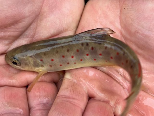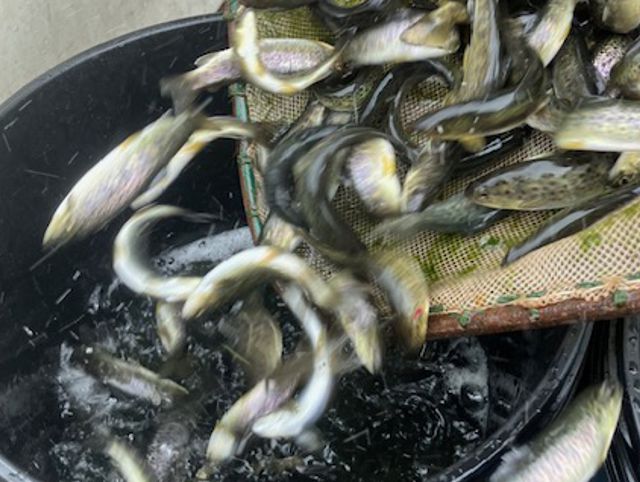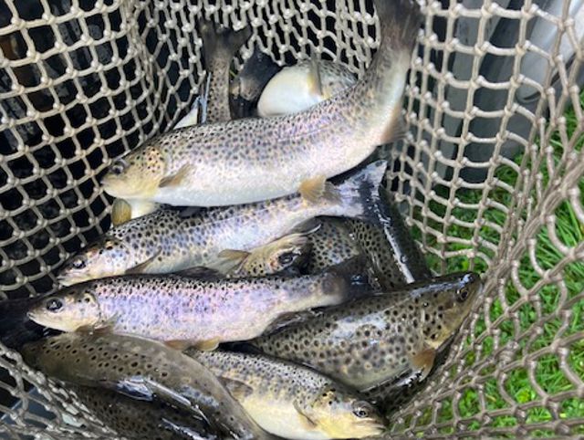 Zlovenie pstruhov z prítoku Suchého potoka, zarybnené ako ikry v januári. Zlovené ryby boli vypustené do Kvačianky.